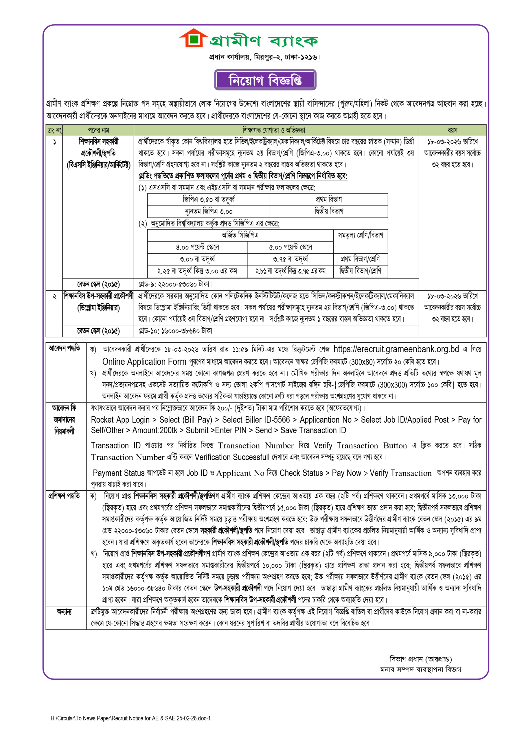 See/download the Grameen Bank Job Circular 2026, Job Apply Instructions, Job Application Form, Application Fee, Payment Process, Salary, Age, and Other Information from the image below: